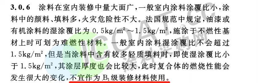 标准中同样也提及了,涂料在室内装修中量大面广,一般室内涂料涂覆比小,涂料中的颜料、填料多,火灾危险性不大。规范中规定,油漆或有机涂料的湿涂覆比为0.5kg/㎡~1.5kg/㎡,施涂于不燃性基材上时可划为难燃性材料。一般室内涂料湿涂覆比不会超过1.5kg/㎡,但是当涂料中含有较多轻质填料时,即使湿涂覆比小于 1.5kg/㎡,其涂层厚度也会比较大,此时复合体的燃烧性能会发生很大的变化,不宜作为B1级装修材料使用。