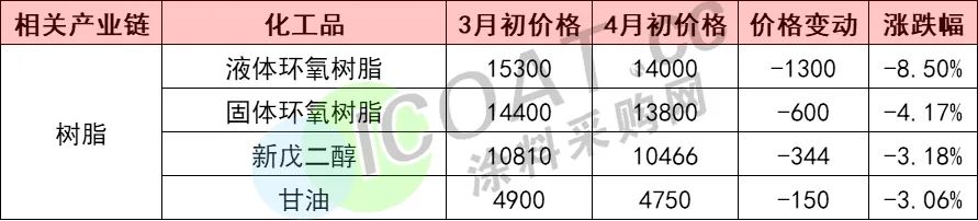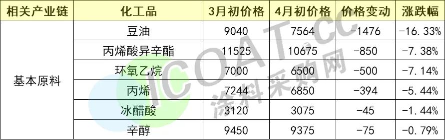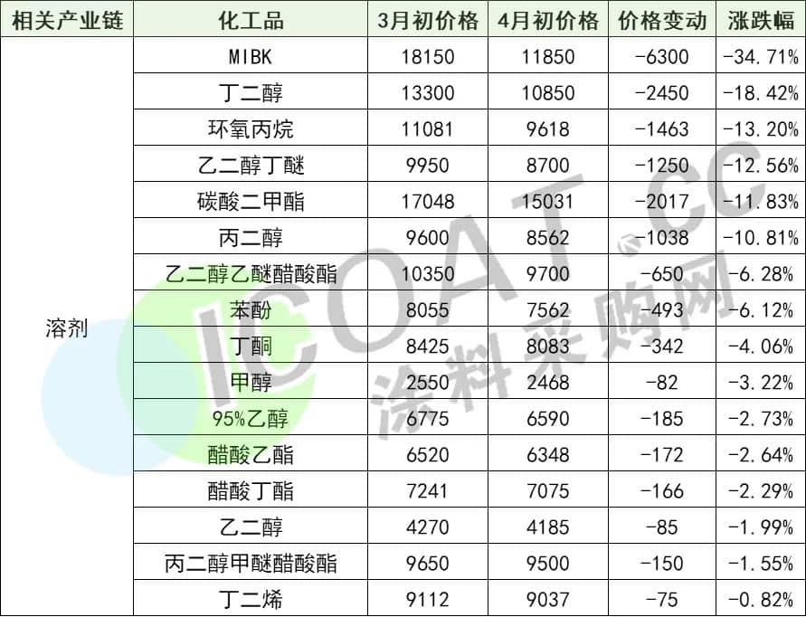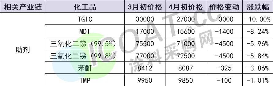 TGIC的价格下跌对于其下游涂料行业而言,无疑是一种利好。原材料价格跌宕起伏的一季度已经过去,不少涂料人十分关注产业链上原材料价格的变动,那么它们的价格是不是也出现了“大滑坡”呢?