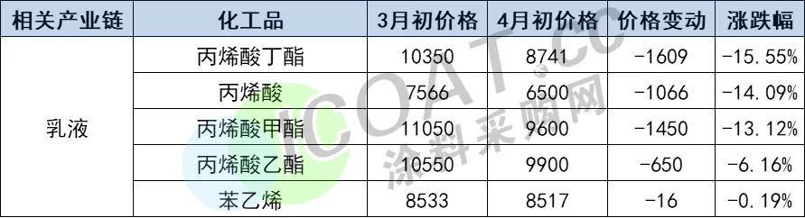 乳液产业链部分原材料价格变动表(单位:元/吨)