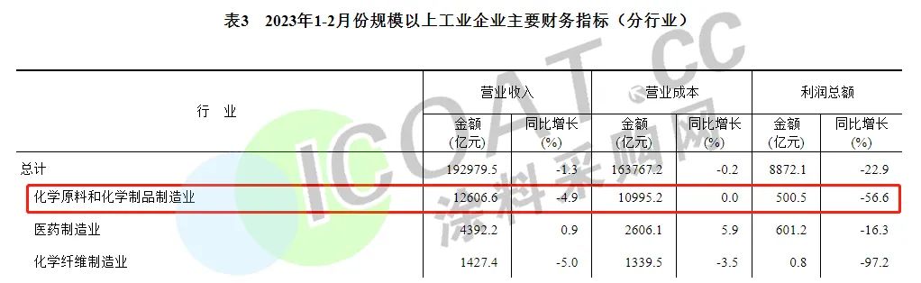另外一个重要因素就是下游市场的巨大压力。进入2023年以来,下游至终端行业对后市信心不足,内需订单不足,导致对原料采购积极性较低。不少化工企业都表示订单数量有所下滑,订单腰斩者众多。根据国家统计局数据,2023年1-2月化学原料与制品行业实现收入12606.6亿元,累计同比下降4.9%;实现利润总额500.5亿元,累计同比大幅下降56.6%,主要化工品景气度普遍下滑。
