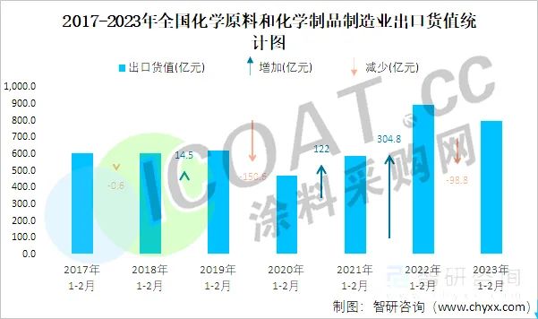 更为严峻的是,作为出口大国,从去年10月到今年2月,我国外贸出口以美元计都是负增长,外贸企业也面临一些制约因素和困难,经营压力增加等。2023年1-2月,中国出口总额5063亿美元,同比下降6.8%,全国化学原料和化学制品制造业累计出口货值为796.3亿元,累计同比下降9.5%。纵观近7年1-2月全国化学原料和化学制品制造业出口货值数据,2022年1-2月达到最大值,2023年的数据同比减少了98.8亿元。这也意味着,近100亿货值化工品出口受限,可能会转向国内市场进行内销。