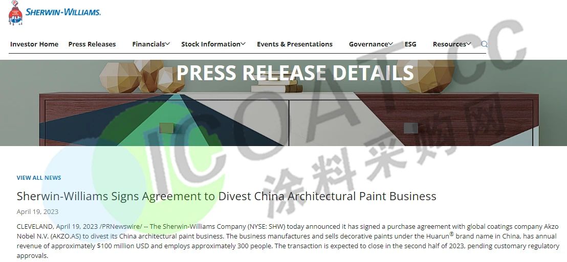 宣伟同意收购意大利知名工业木器涂料品牌Industria Chimica Adriatica;