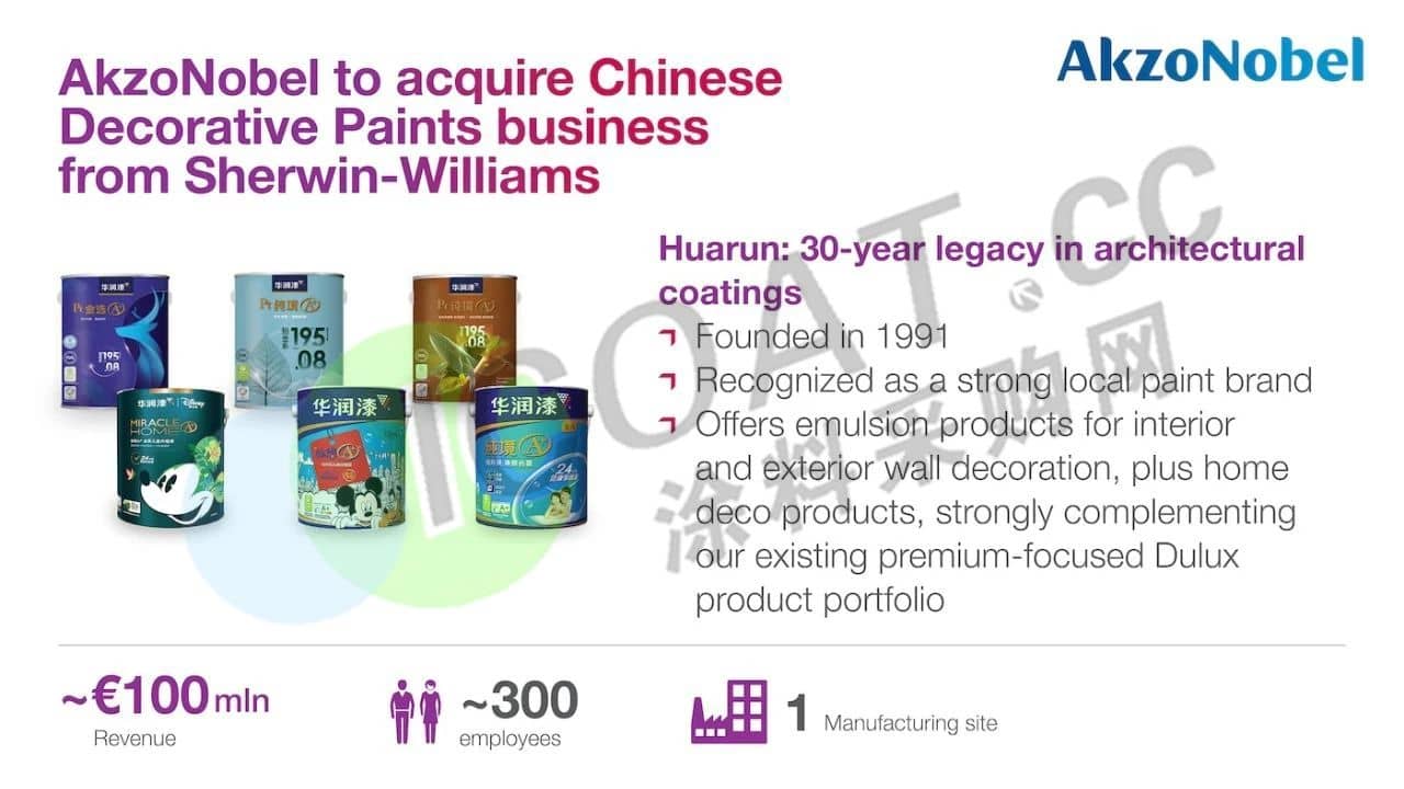 近日,阿克苏诺贝尔与宣伟两大涂料企业达成协议,阿克苏诺贝尔收购宣伟旗下的华润漆品牌。此次相关收购业务年销售额预计约1亿欧元(约合人民币7.5亿元),并拥有相关员工约300名。