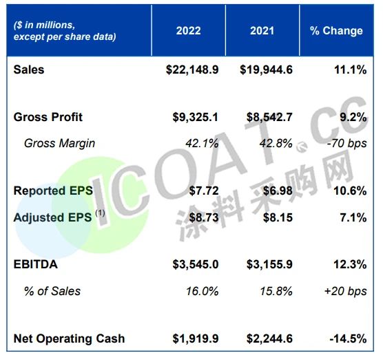 2022年财报显示,宣伟销售额增长11.1%,达到创纪录的221亿美元,受在专业建筑和北美的实力工业终端市场低两位数的定价、低个位数的销量,收购的贡献被轻微的外汇风险部分抵消,毛利润增长9.2%。