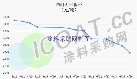 而在现货市场,化工品价格下跌的大戏早已开幕,且在持续进行中。据涂料采购网不完全统计,二季度以来,多种化工品一直处于行情弱势阶段,其中不乏涂料产业链上的多种原材料和上游大化产品,双氧水、新戊二醇等化工原材料价格持续下跌,苯酐更是自4月中旬之前就开始跌价,如今已经12连跌。