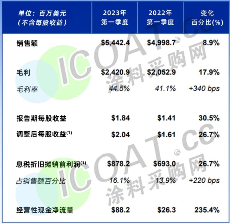 宣伟第一季度合并净销售额增长8.9%,达到54.4亿美元(约合人民币375亿元),净利润达4.77亿美元(约合人民币32亿元),同比增长28.6%,企业在美国和加拿大开业超过12个月的门店净销售额增长了14.2%。