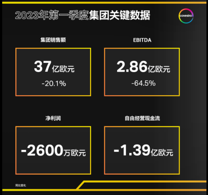 2023年第一季度,主要受销量和销售价格下滑影响,科思创集团销售额同比下降20.1%至37亿欧元(约合人民币281亿元),息税折旧摊销前利润(EBITDA)受销量和利润率下降影响,同比降低64.5%至2.86亿欧元(约合人民币21亿元),但远超企业和市场预期。