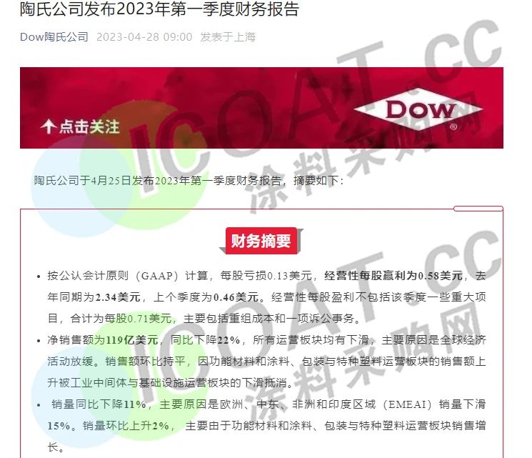 陶氏:净销售额下降22%至119亿美元