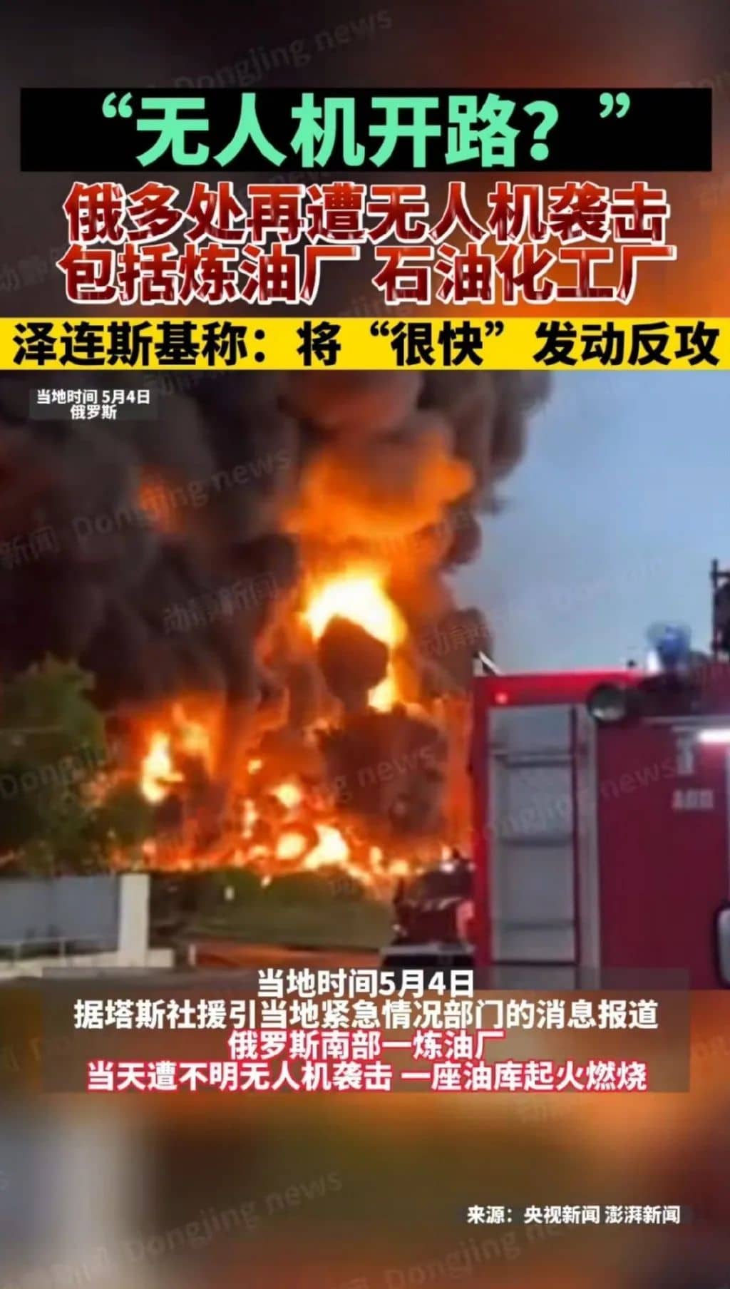 5月4日,俄罗斯克拉斯诺达尔边疆区一家炼油厂遭无人机袭击,导致一储油罐发生火灾。同一天,罗斯托夫州一家石油化工厂遭无人机袭击,并引发火灾,两起袭击事件没有造成人员伤亡。5月1日,中化集团鲁西化工集团聊城鲁西双氧水新材料科技有限公司发生爆炸着火事故,事故造成9人死亡、1人受伤、1人失联。目前,山东省正在对此次事故进行深入调查。