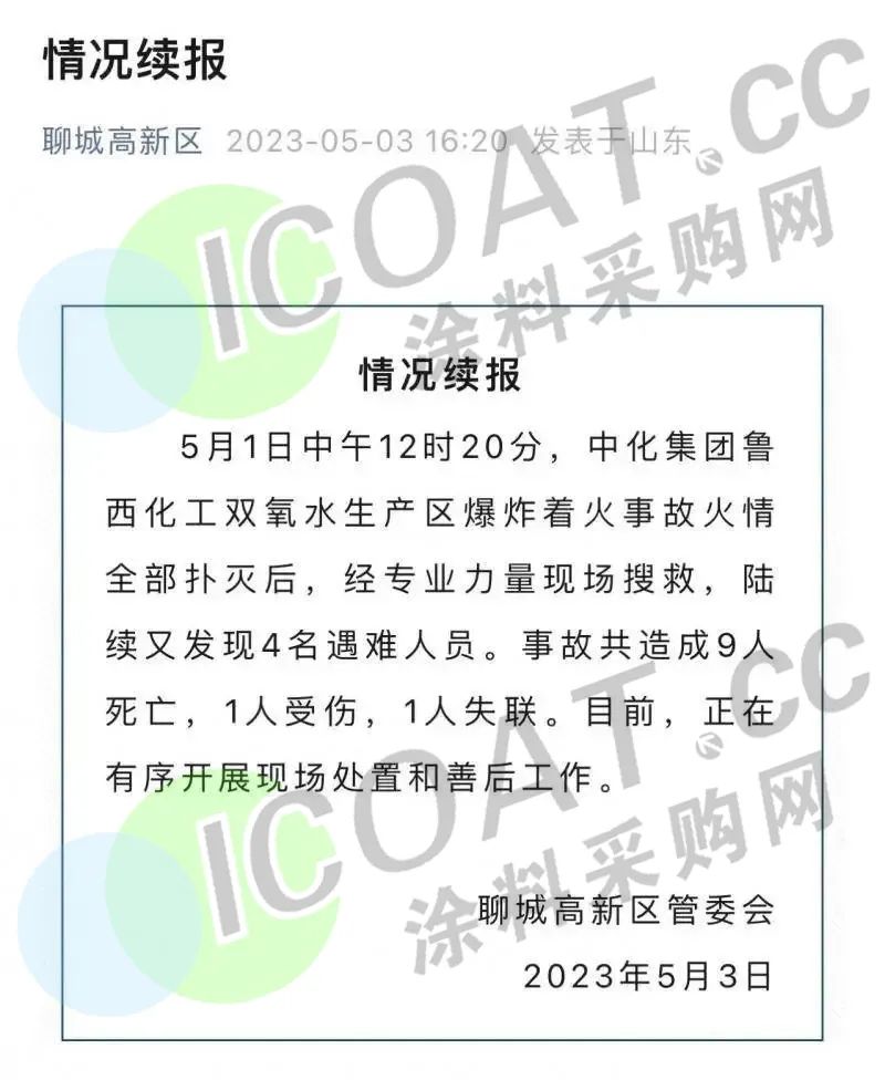 5月1日,中化集团鲁西化工集团聊城鲁西双氧水新材料科技有限公司发生爆炸着火事故,事故造成9人死亡、1人受伤、1人失联。目前,山东省正在对此次事故进行深入调查。