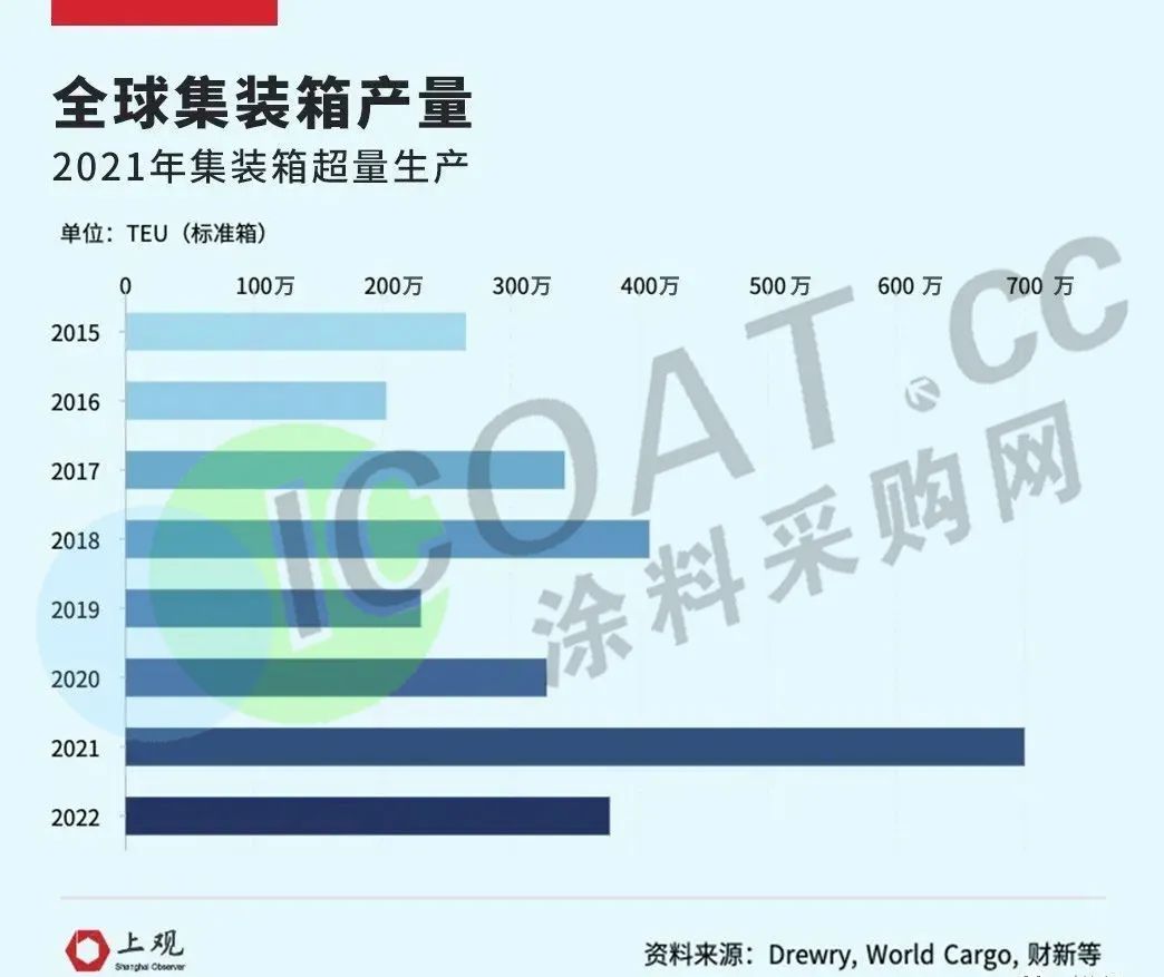 全球最大集装箱制造商之一的中集集团,2023年一季度营收为266.5亿元,同比下降25.05%;净利润1.6亿元,同比下降90.61%;其财报中提及的“2023年第一季度,海运市场景气度整体比较疲弱,集装箱贸易出现持续下滑,新箱需求不足”也揭开了集装箱市场难言的痛,而产业链上游的集装箱涂料业务也被波及,多家企业的业绩揭露了惨淡的一幕。