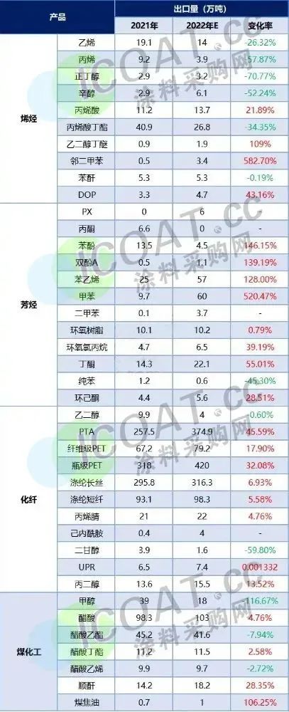 2022年化工行业累计出口额3049.5亿美元,占全行业累计出口总额比重为80.4%。其中烯烃、芳烃、化纤、煤化工等领域的乙烯、丙烯、正丁醇、PX、二甲苯、双酚A等多种化工品出口数量较大,全年约2000万吨化工品出口,涉及品类近400种。