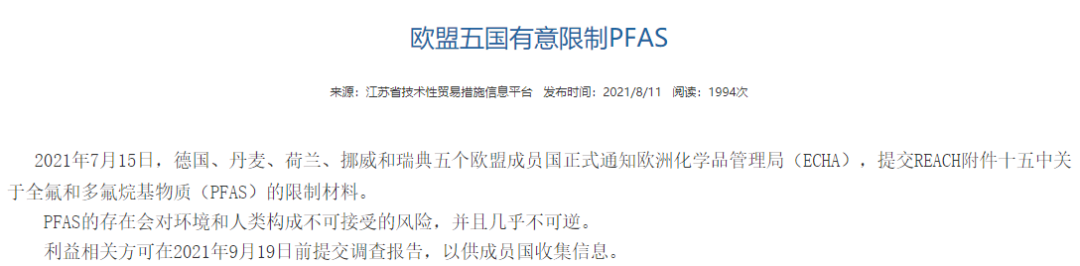 德国广播联盟报道,欧盟委员会随后将与成员国一起决定对如何对生产和使用PFAS进行法律约束和限制。根据联邦环境署的说法,限制可能最早要到2025年就能实现。
