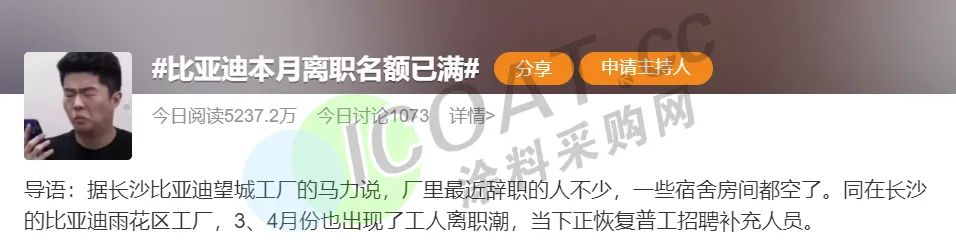 近日,网传比亚迪湖南省长沙市望城区、雨花区的两座工厂遭遇“离职潮”,多名员工还得到“本月离职名额已满”的回复。相关负责人回应称,“经核实,‘离职名额已满’、‘排队辞职’等说法与事实不符。”