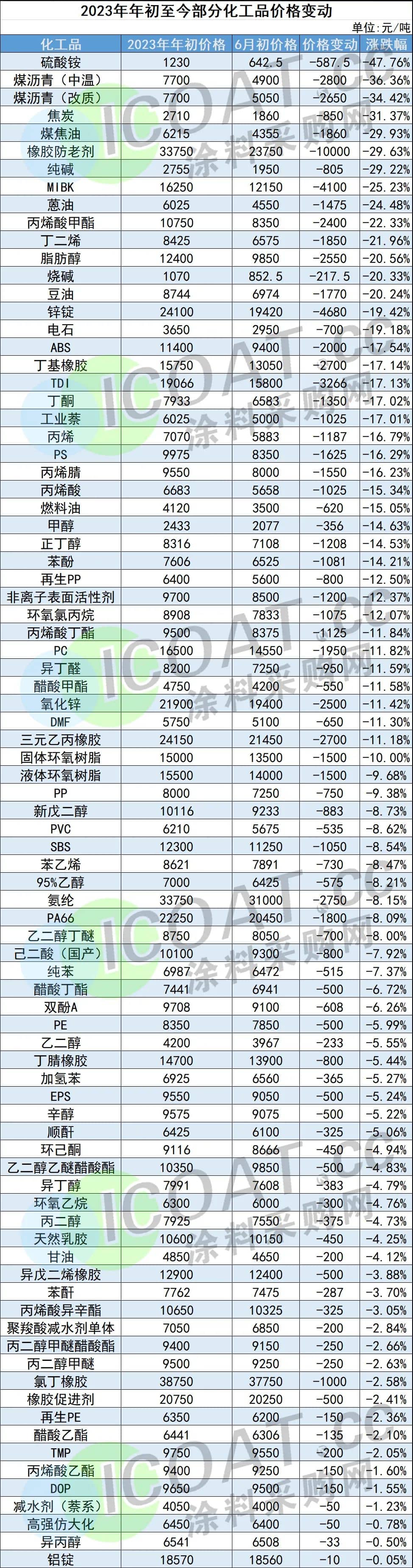 据涂料采购网信息中心数据,自年初以来,100多种化工原材料价格下滑,其中硫酸铵跌幅为47.76%,几乎腰斩;煤沥青、MIBK、丙烯酸甲酯、TDI、ABS等原材料吨价下跌超过千元。
