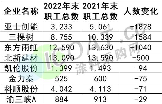 通过涂料上市公公司2022年财报数据可知,多家涂企2022年年末职工总数较2021年末职工总数有所减少。这还只是公开了的数据,未公开的数据却难以明晰,但涂料行业被优化掉的职工远不止表格中的5200余人。