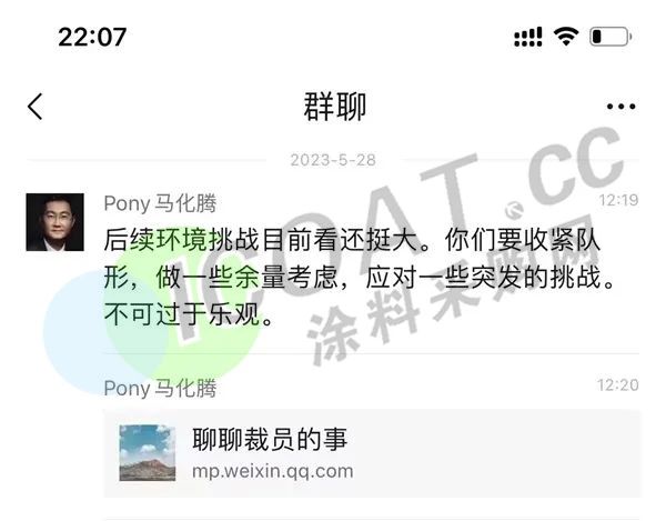 马化腾在微信群中转发了一篇《聊聊裁员的事》的文章,并表示:“后续环境挑战目前看还挺大,你们要收紧队形,做一些余量考虑,应对一些突发的挑战,不可过于乐观”。
