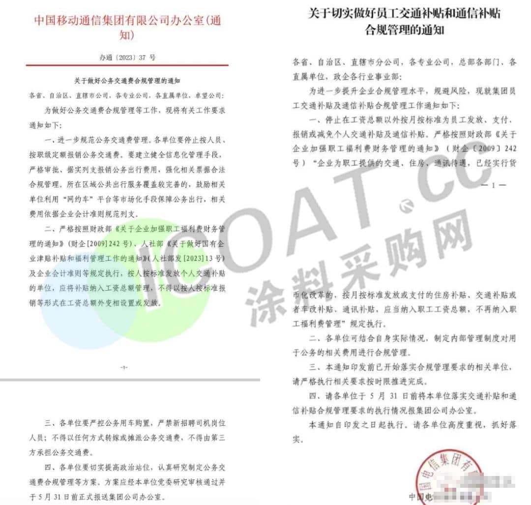 有消息称,中国联通、中国移动、中国电信的员工近期收到通知,称通信补贴、交通补贴取消了。网上流传的通知显示,要在合规管理或减免个人交通、通信补贴等。某员工表示,部分一线员工每个月就一千多元工资,靠一些补贴提高收入,现在是变相逼人走。还有员工表示之前每月有1200元交通补贴,已收到通知六月起取消,这意味着到手工资即将减半。