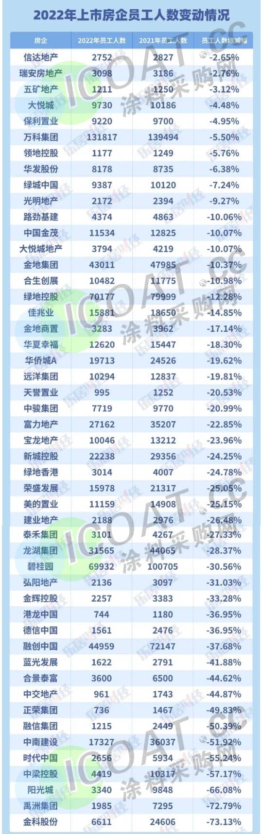 相比2019年,三年来地产开发从业人员减少了40万,地产开发上下游产业减少约600万个岗位。2022年,57家典型上市房企总员工人数为127.7万人,同比上年度减少约11.65%,减员人数高达18.6万人。共有47家员工人数同比减少,比例多在20-40%之间。