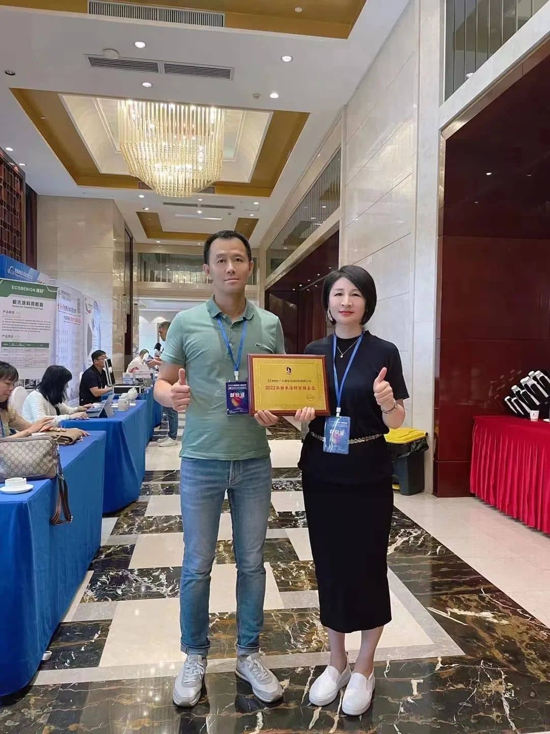 涂料采购网张馨元与擎天材料辜部长(左)合影