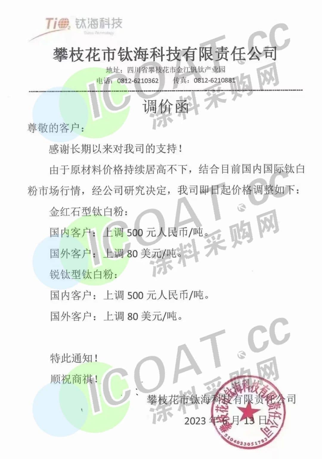 近日,钛白粉行业再起风云。攀枝花市钛海科技发布调价函,称即日(6月13日)起,金红石型、锐钛型钛白粉,国内客户上调500元/吨,国外客户上调80美元/吨。