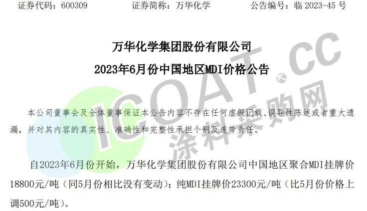 万华化学:自2023年6月份开始,万华化学集团股份有限公司中国地区纯MDI挂牌价23300元/吨(比5月份价格上调500元/吨)。