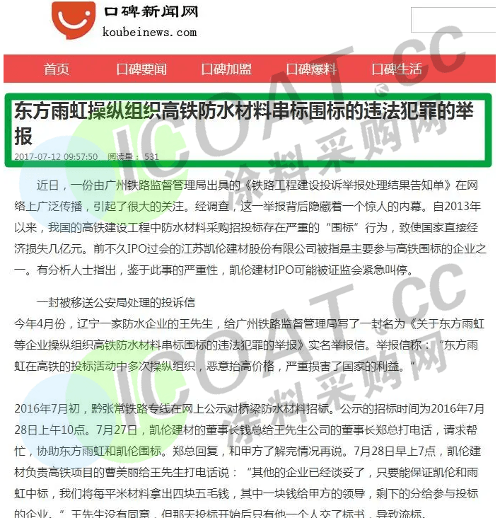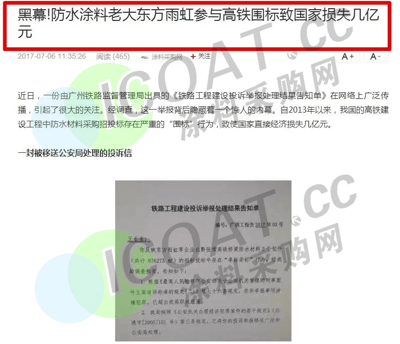 辽宁某防水企业的王先生实名举报,东方雨虹在高铁的投标活动中多次操纵组织,恶意抬高价格,严重损害了国家的利益。东方雨虹负责高铁项目的人员组织会议,要求其他厂家的投标价格高于雨虹和凯伦。并表示只要能保证凯伦和雨虹中标,将每平米材料拿出四块五毛钱,其中一块钱给甲方的领导,剩下的分给参与投标的企业。从2013年之后,全国高铁项目的防水材料采购总额超过20亿元,因防水材料围标给国家造成的直接经济损失达六七亿元之多。