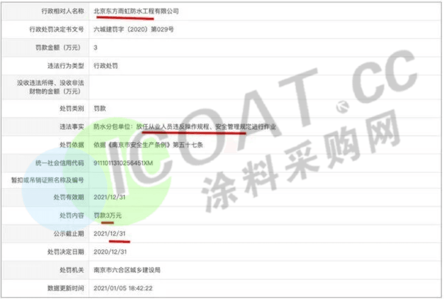 据南京人民政府网消息,北京东方雨虹防水工程有限公司因防水分包单位放任从业人员违反操作规程、安全管理规定进行作业的违法事实被罚。