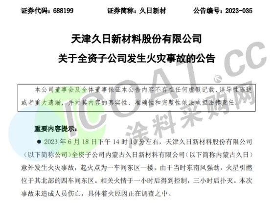 近日,化工行业上市公司天津久日新材料股份有限公司发布公告,称全资子公司内蒙古久日意外发生火灾事故,本次事故未造成人员伤亡,具体着火原因正在调查之中。