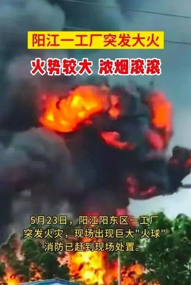 5月23日,广东阳江市阳东区北惯镇一喷漆厂发生大火并伴发爆炸。现场巨大“蘑菇云”“火球”喷涌,附近消防救援迅速赶赴扑灭。