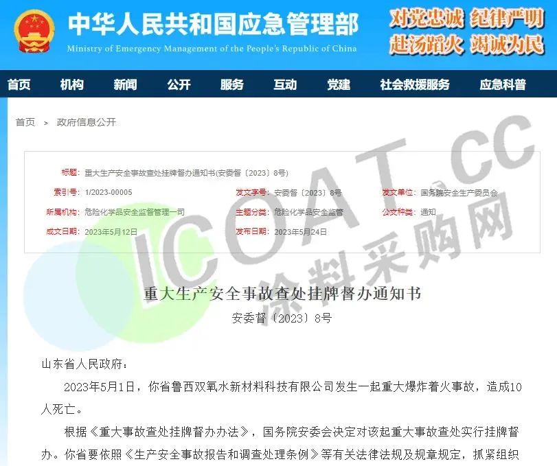 5月1日,中化集团鲁西化工集团聊城鲁西双氧水新材料科技有限公司发生爆炸着火事故,事故造成10人死亡。