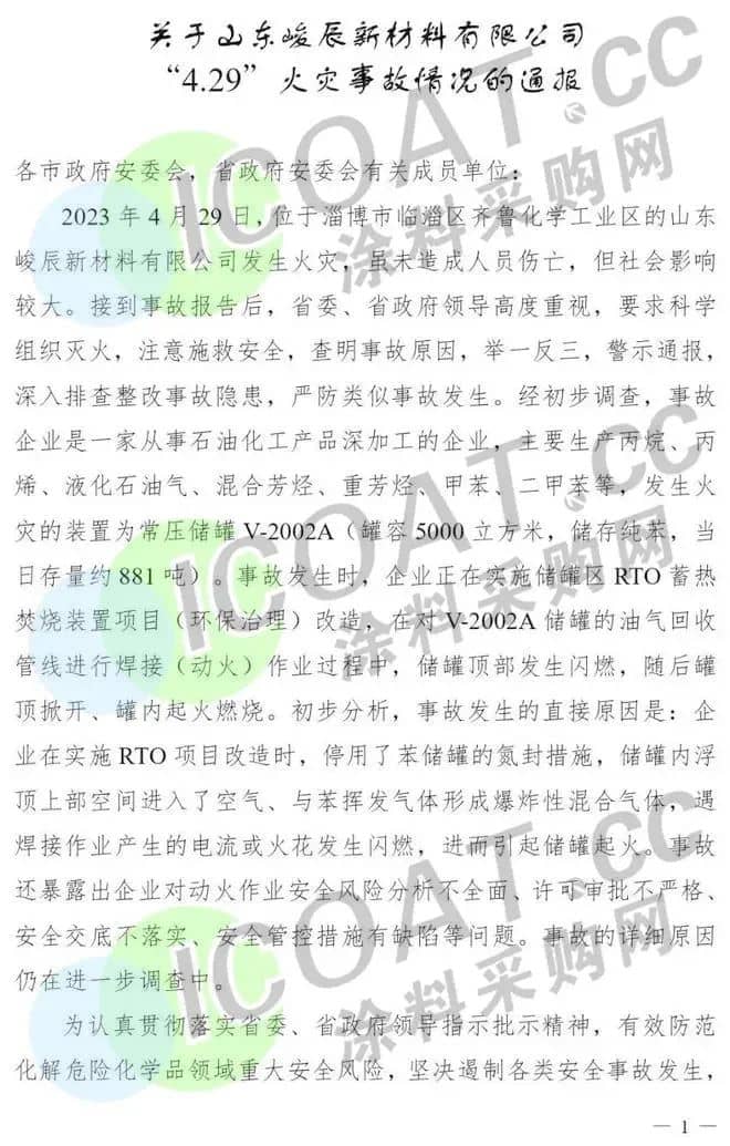 4月29日,山东淄博峻辰新材料有限公司西罐区一纯苯储罐(内浮顶罐,容积5000立方)发生火灾事故,未造成人员伤亡。