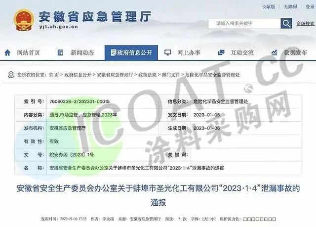 1月4日,安徽省蚌埠市圣光化工有限公司发生混酸(硫酸和硝酸混合物)泄漏事故,事故未造成人员伤亡,但造成较大社会影响。