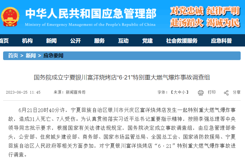 近日,应急管理部发布消息,对于6月21日宁夏银川兴庆富洋烧烤店发生的特别重大燃气爆炸事故,国务院决定成立事故调查组,由应急管理部牵头,公安部、住房城乡建设部、商务部、国家市场监管总局、全国总工会、国家消防救援局、宁夏回族自治区人民政府等相关方面参加,对宁夏银川富洋烧烤店“6·21”特别重大燃气爆炸事故进行调查。