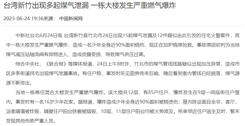 6月24日,台湾新竹县竹北市出现15起煤气泄漏及12件疑似由此引发的住宅火警案件,其中一栋大楼发生严重燃气爆炸,造成一名少年全身近90%面积烧伤、现正在加护病房抢救。事故原因初判为当地煤气减压站轴流阀有异物进入、造成皮膜受损,导致煤气供压过高,周边上百住户紧急疏散。