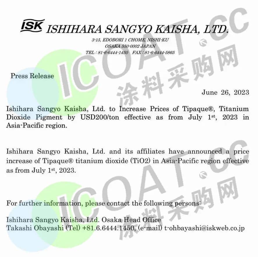近日,日本石原ISK发布涨价函,称7月1日起,钛白粉在亚太地区价格将上调200美元/吨。