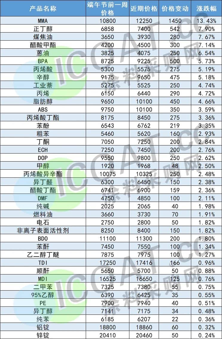 涂料采购网信息中心数据显示,40多种化工品价格较半个月前(端午前一周)报价有所上调,但幅度普遍较小,其中MMA小涨13%。