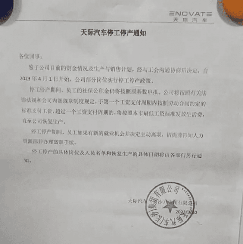 发布停工停产通知,鉴于公司目前的资金情况及生产与销售计划,自2023年4月1日开始,部分岗位实行停工停产政策。内部人员表示,而在正式停工之前,该企业其实已经连续数月拖欠工资。