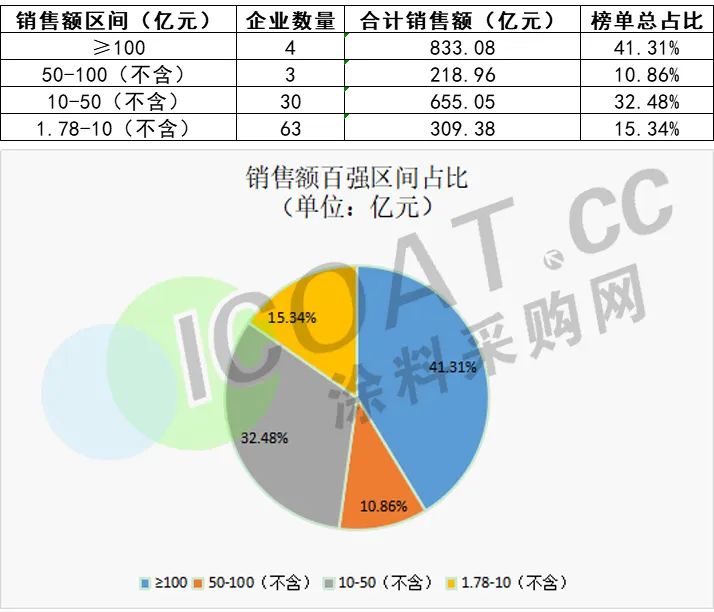 从销售额情况来看,2022年销售额TOP100涂料企业合计销售额达到2016.47亿元,同比去年数据增长了约5%。其中销售额在100亿元以上、50亿元-100亿元(不含)的企业分别有4家、3家,合计销售额占100强总销售额的41.31%、10.86%。10亿元-50亿元(不含)、1.78亿元-10亿元(不含)的企业分别为30家和63家,占比为32.48%和15.34%。