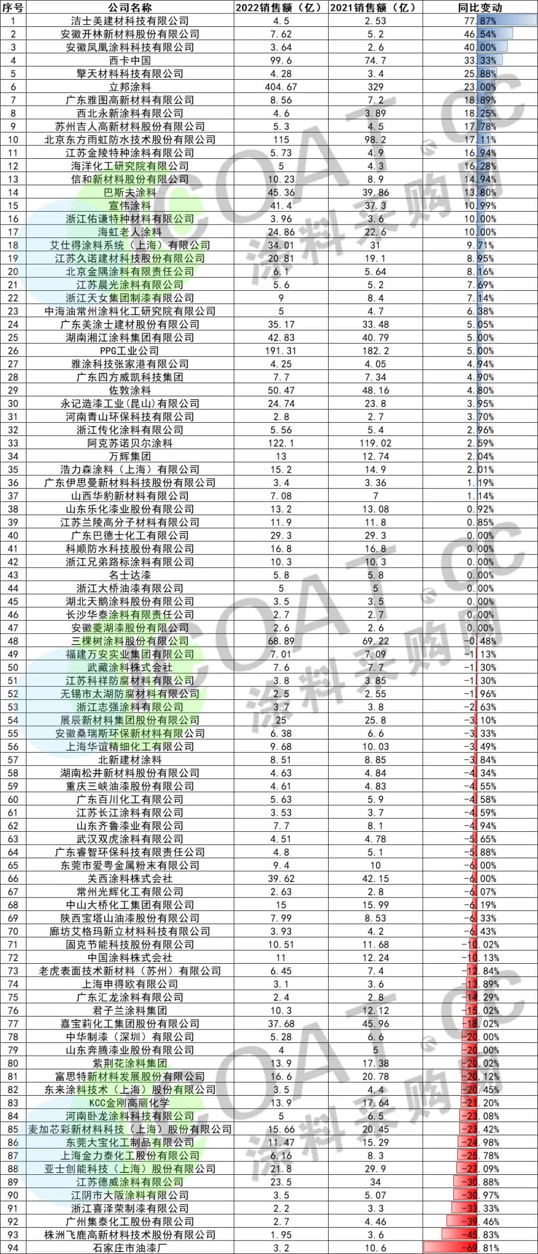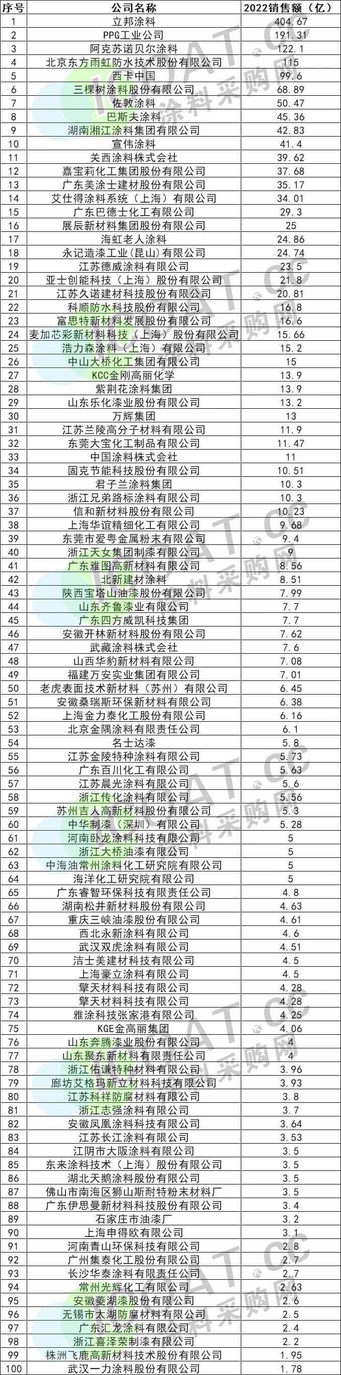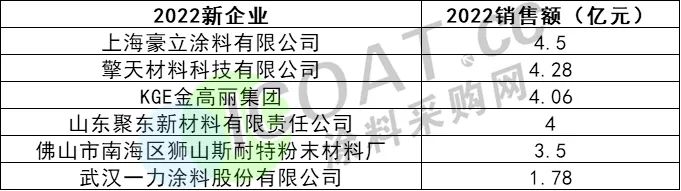 同时我们可以看到,2022年销售额100强新上榜企业共6家,分别为上海豪立涂料有限公司、擎天材料科技有限公司、KGE金高丽集团、山东聚东新材料有限责任公司、佛山市南海区狮山斯耐特粉末材料厂、武汉一力涂料股份有限公司,销售额在1.78亿元-4.5亿元左右,且多半都是民族企业。这也意味着民族企业正在崛起,有很大的希望能够在未来几年看到越来越多的民族企业上榜涂料销售额TOP100的榜单。