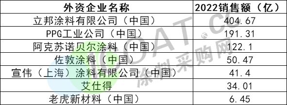 立邦涂料、PPG工业公司、阿克苏诺贝尔涂料这三家涂料企业位居冠亚季军位置,2022年销售额分别为404.67亿元、191.31亿元、122.1亿元,且已经蝉联三年。值得注意的是,TOP10中,除了三家外资企业,东方雨虹是唯一一家销售额超过100亿的民族涂料企业。