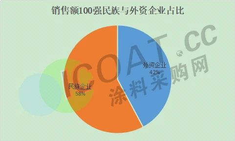 在销售额100强中,仅7家外资涂料企业上榜,分别为阿克苏诺贝尔涂料(中国)、艾仕得、立邦涂料有限公司(中国)、老虎新材料(中国)、PPG工业公司(中国)、宣伟(上海)涂料有限公司(中国)、佐敦涂料(中国),合计销售额为850.41亿元,占TOP100涂料企业总产量的42%。这也就意味着,民族涂料企业在100强销售额中占比约为58%,即将突破6成。