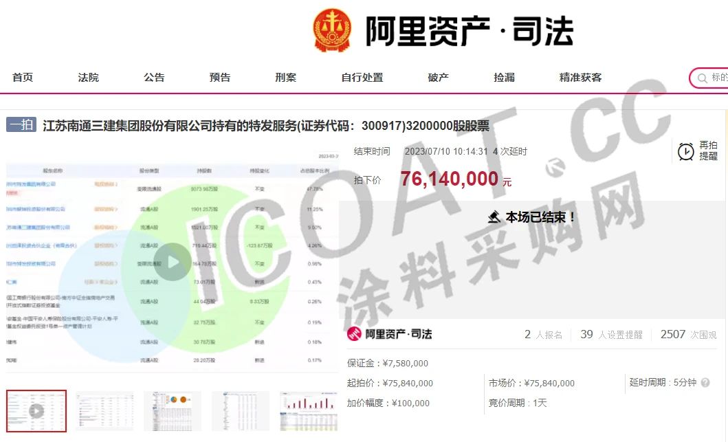 近日,深圳市特发服务股份有限公司公告,股东江苏南通三建集团股份有限公司股份将被司法拍卖。南通三建所持有的特发服务无限售条件流通股共计320万股,占其所持全部股份的21.04%,占特发服务总股本的1.89%。截至目前,南通三建所持特发服务股份15,210,000股,累计被冻结股数15,210,000股,累计被拍卖14,510,000股,占其所持全部股份的95.40%。