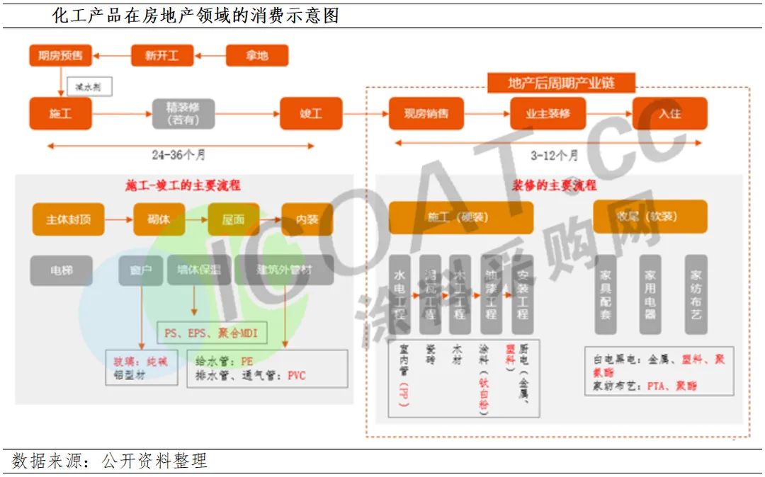 其中化工品的消耗几乎贯穿于施工、竣工到装修、入住的整个建设周期,PE、PVC等主要是建筑外管材的主要原料,而涂料、室内管主要应用在施工阶段,两者涉及钛白粉、PP等众多化工原料。此外,塑料、聚氨酯之于家电、化纤之于软装则是在装修阶段,属于地产后周期产业链,两阶段对于化工品的涉及面则更加广泛。