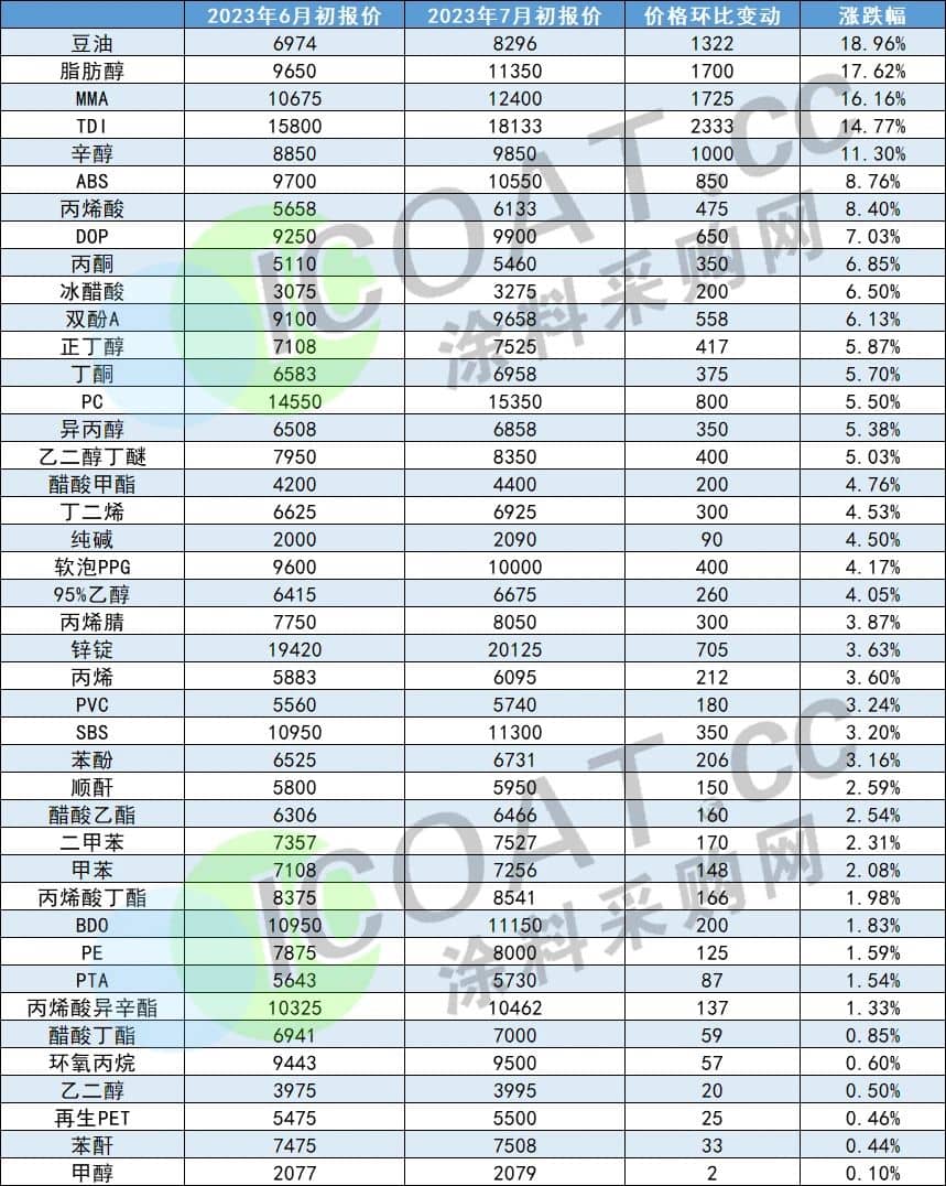 涂料采购网信息中心数据显示,7月初,40多种化工品价格环比6月初出现价格上涨的趋势,其中MMA、TDI、辛醇、脂肪醇等吨价上涨超1000元。