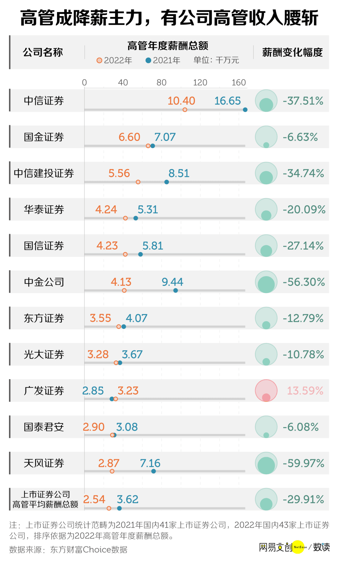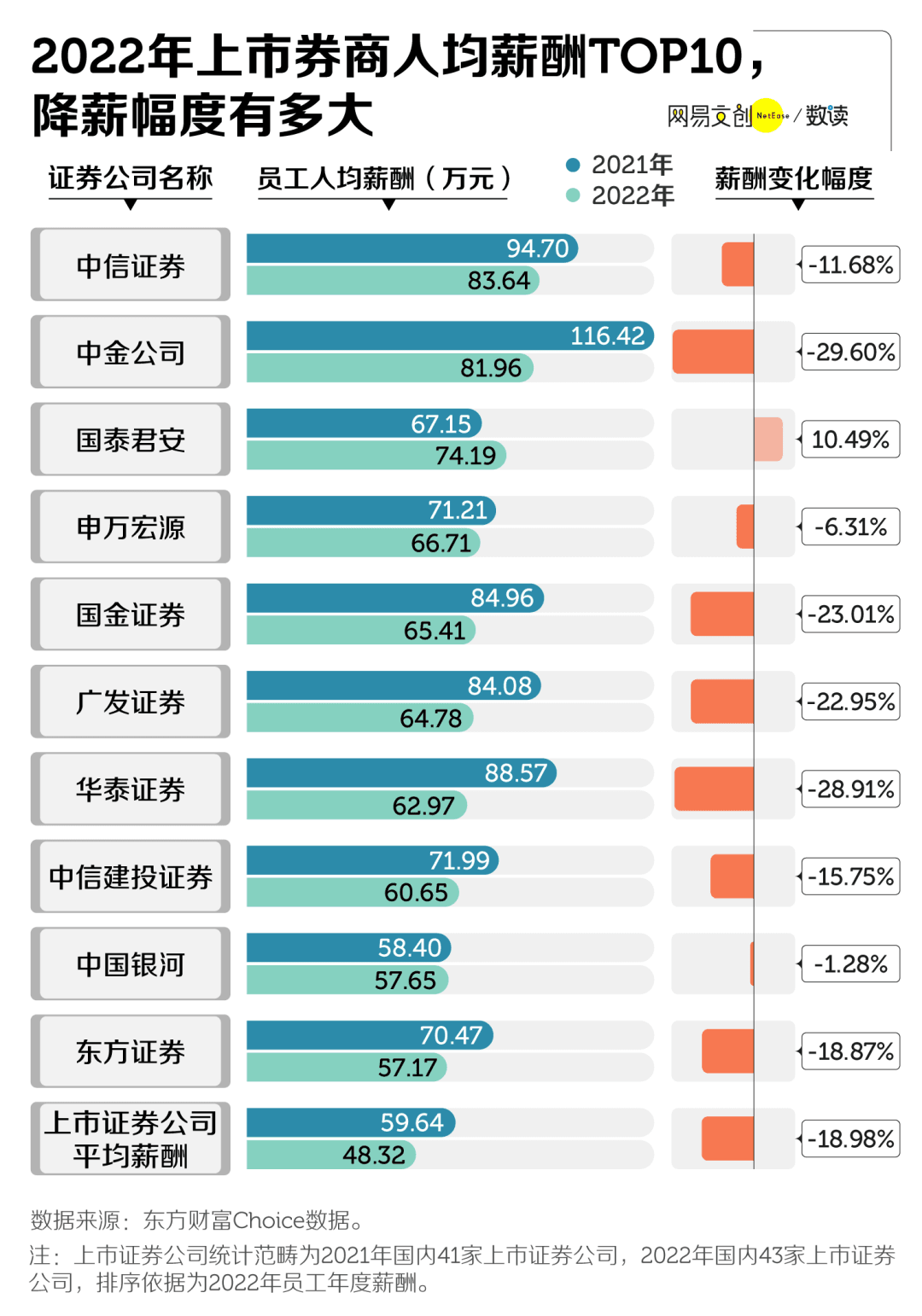 2022年国内43家上市券商的员工人均薪酬从2022年的59.64万下降到48.32万,降薪幅度达到18.98%。某券商的副总经理薪酬由2021年的527.78万元下降至2022年的110.97万元,总经理与监事的薪酬降幅均超过了百万元,头部券商中金公司降幅达到了29.60%,人均年薪从116.4万骤降到了81.9万元。