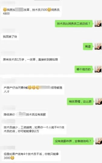 某网友晒出猪场技术员的聊天记录,猪场坐标湖南,5000头母猪场,该场现在在改革,技术员薪资从原来的1.2万直接砍到3500元,而且还是没扣伙食费、电费、五险一金。网友表示,如今配怀5个技术员都离职了,配怀的猪已经三天没喂了。