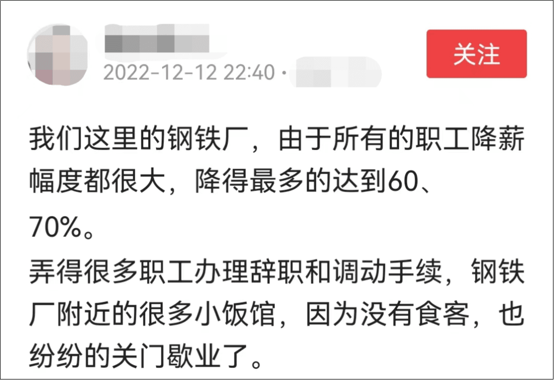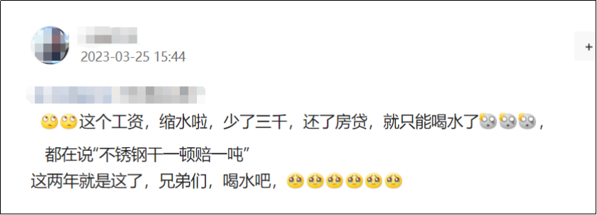 不少钢企开始逐渐采取降薪措施,以减轻经营压力。某网友表示,钢铁厂已经降薪60%-70%,很多员工辞职调动,周围的饭馆都没有食客了。也有网友说,工资缩水3000元,只能喝水了。