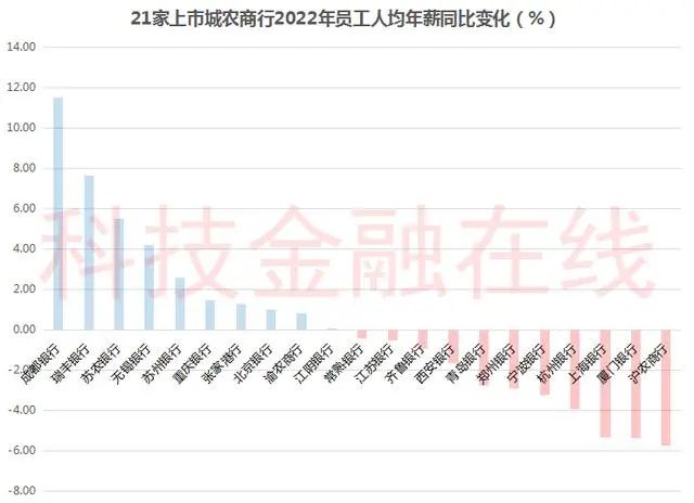 2022年10家上市股份银行中,人均年薪下降的占到了8成,降薪幅度超过5%的就有3家,分别是渤海银行、民生银行和平安银行。21家上市城农商行中,2022年员工人均薪酬出现下降的有11家之多,幅度超过5%的就有3家,分别是沪农商行、厦门银行、上海银行。