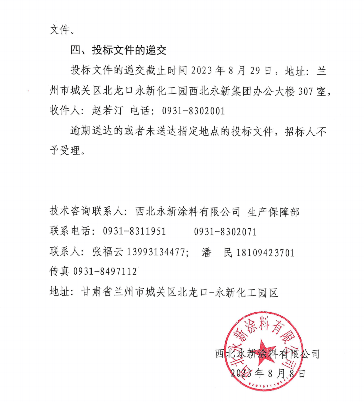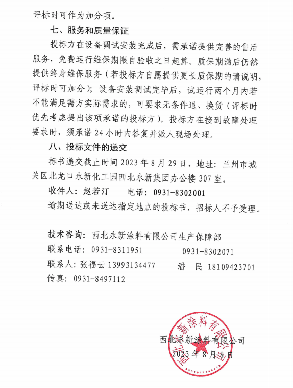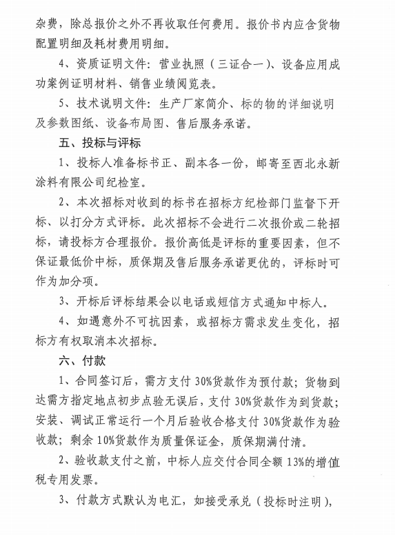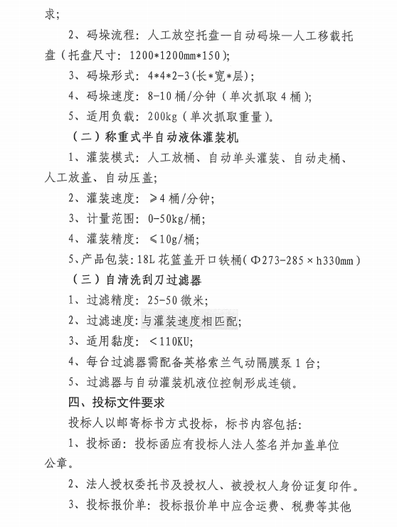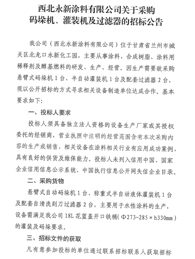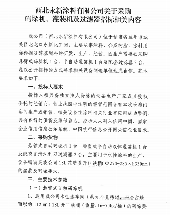 日前,西北永新涂料有限公司发布关于采购码垛机、灌装机及过滤器的招标公告称:西北永新涂料有限公司位于甘肃省兰州市城关区龙口永新化工园,主要从事涂料、合成树脂,涂料用稀释剂及醇基燃料的研发、生产、经营,因生产需要欲采购悬臂式码垛机1台,半自动灌装机1台及配套过滤器2台,现以公开招标的方式寻求相关设备制造单位达成合作。基本要求如下: